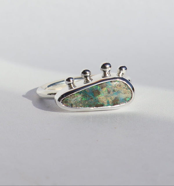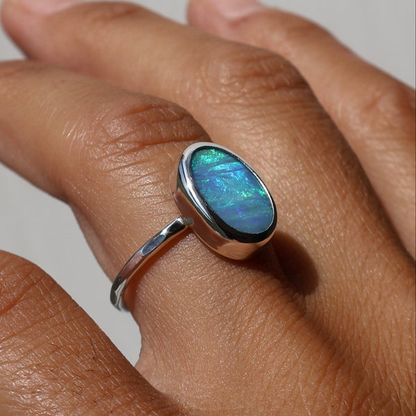 “I absolutely love my ring from Kpezzi. The colors in the opals are gorgeous and I was able to find a green color which fits my personality perfectly. The sizing for the ring is perfect! You can tell this ring is handmade as the personality and careful craftsmanship is displayed in the character of the ring. Pictures don’t do justice for the depth of color in this ring. I absolutely love it and the person behind its creation!”