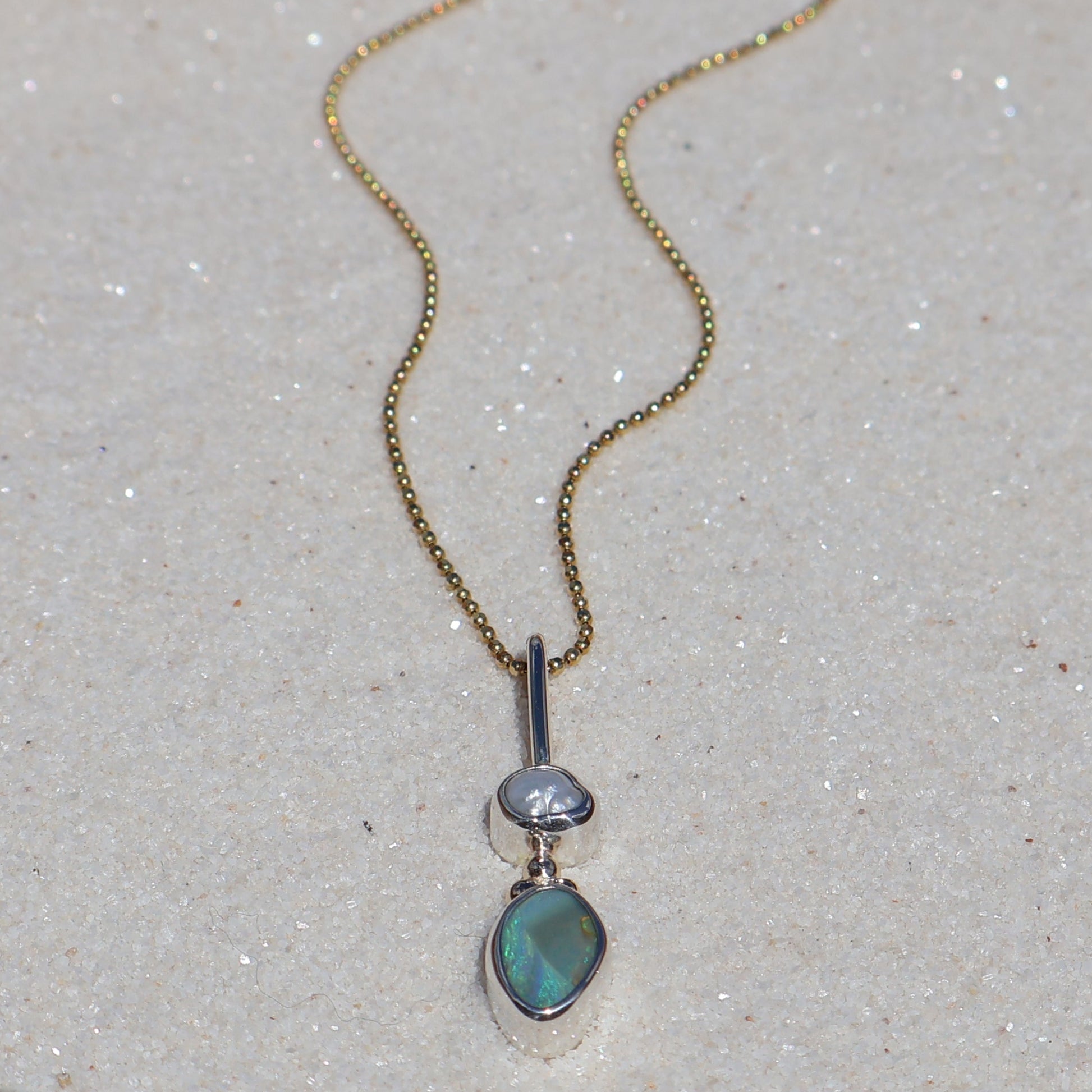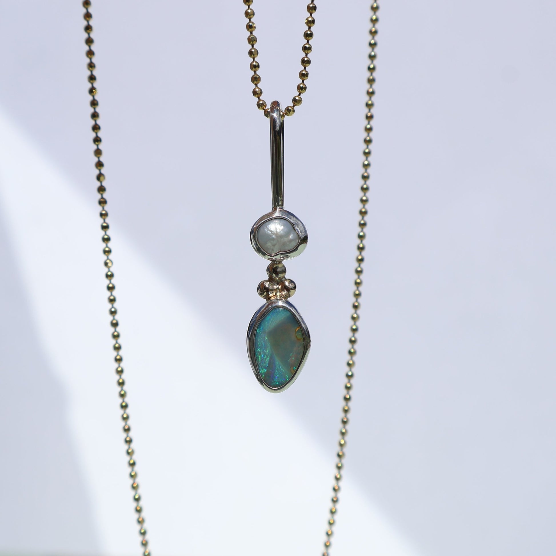 A bright blue Australian opal and a freshwater pearl come together in this elegant piece, each housed in fine silver, joined by a delicate 14k gold detail.