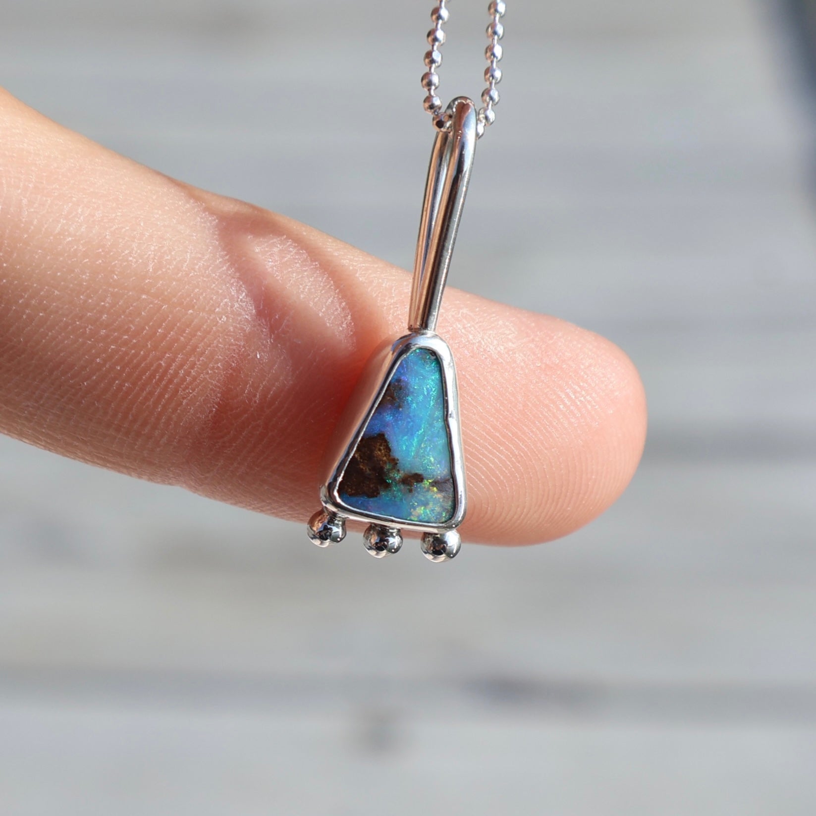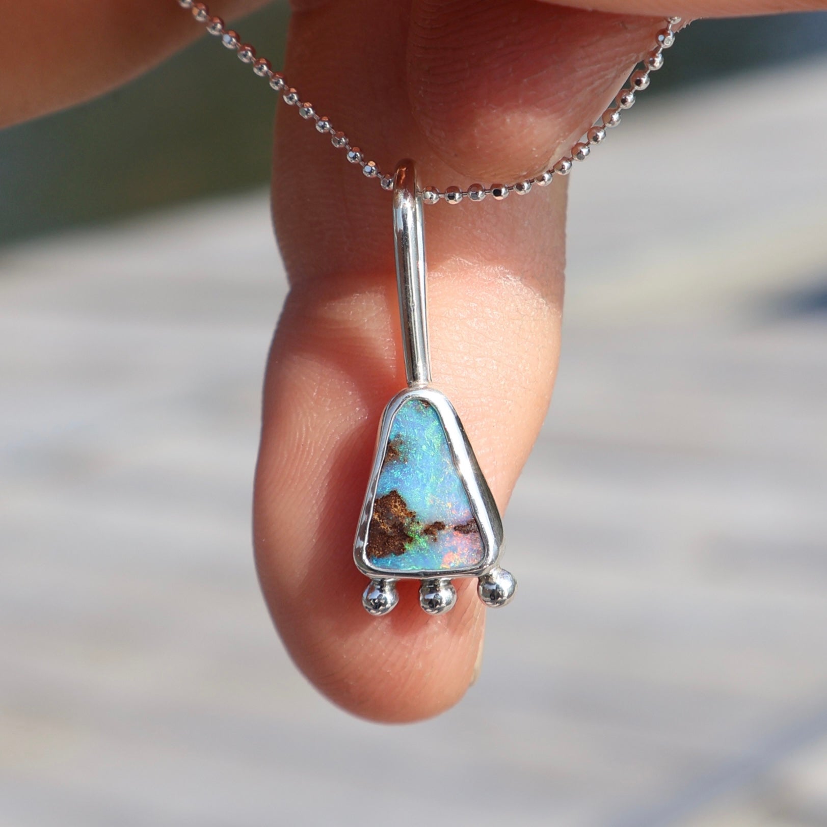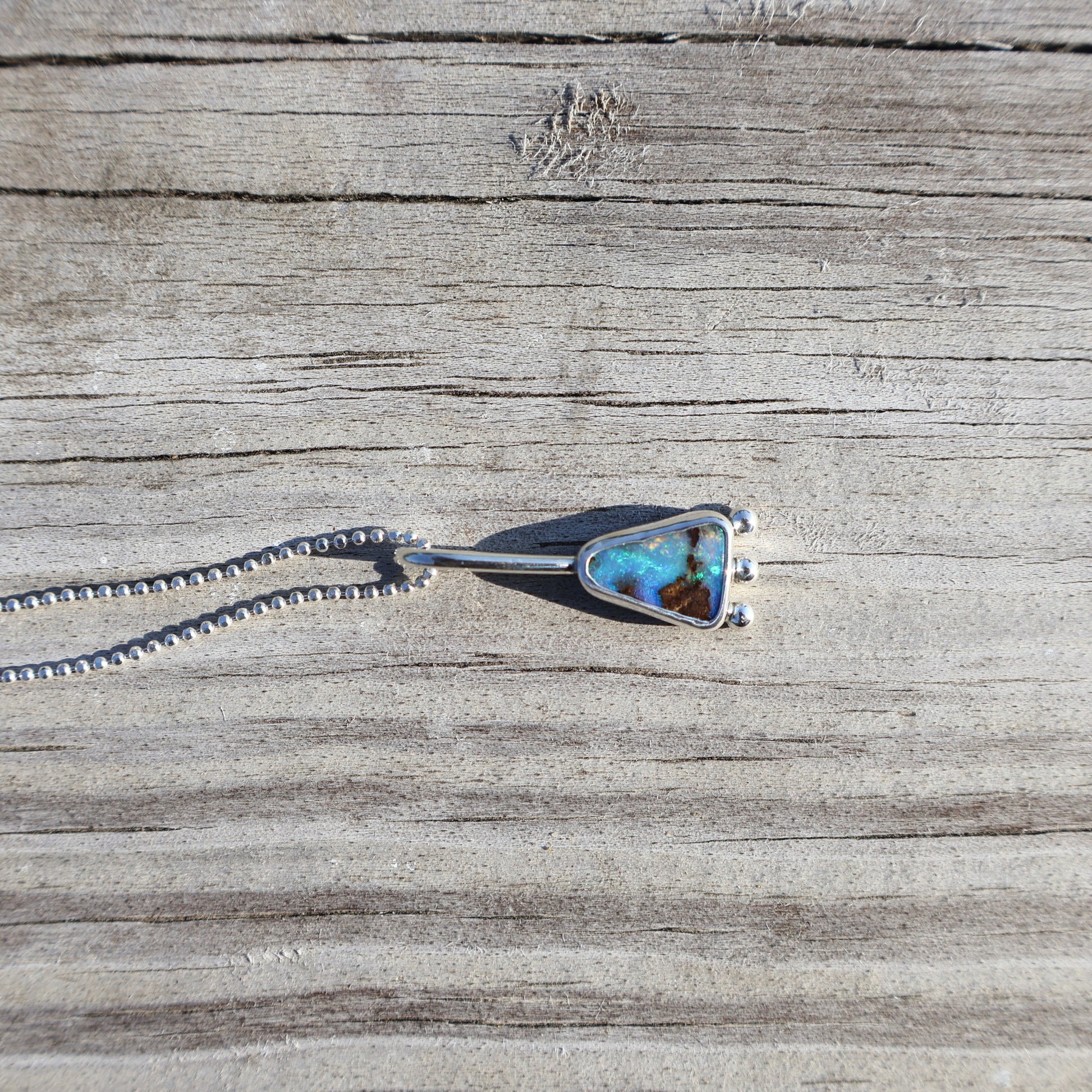 This stunning blue Australian opal pendant features a vibrant play of color, showcasing deep ocean blues with flashes of green and pink. Set in sleek, high-polish sterling and fine silver, the natural opal's unique pattern adds a touch of elegance and mystique.
