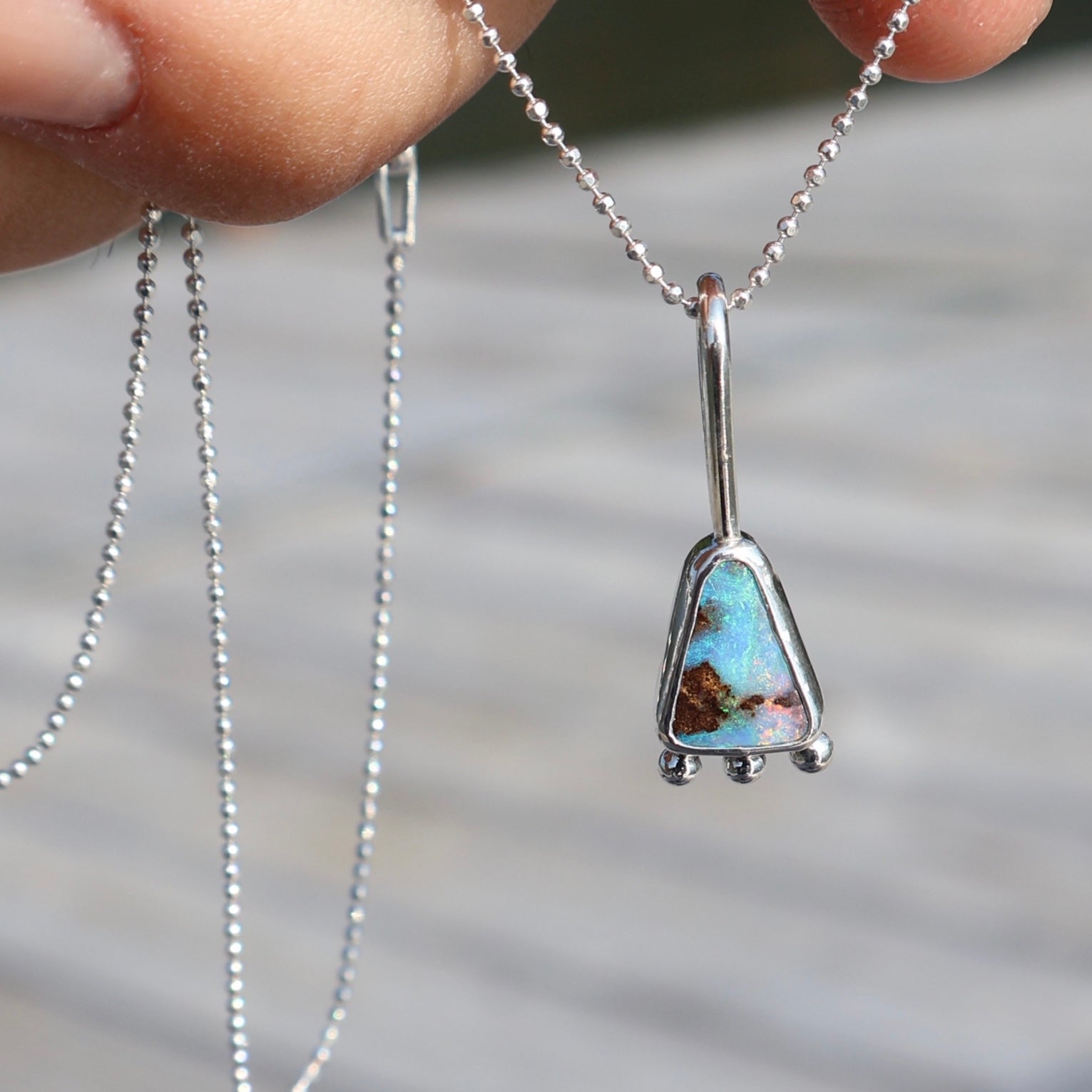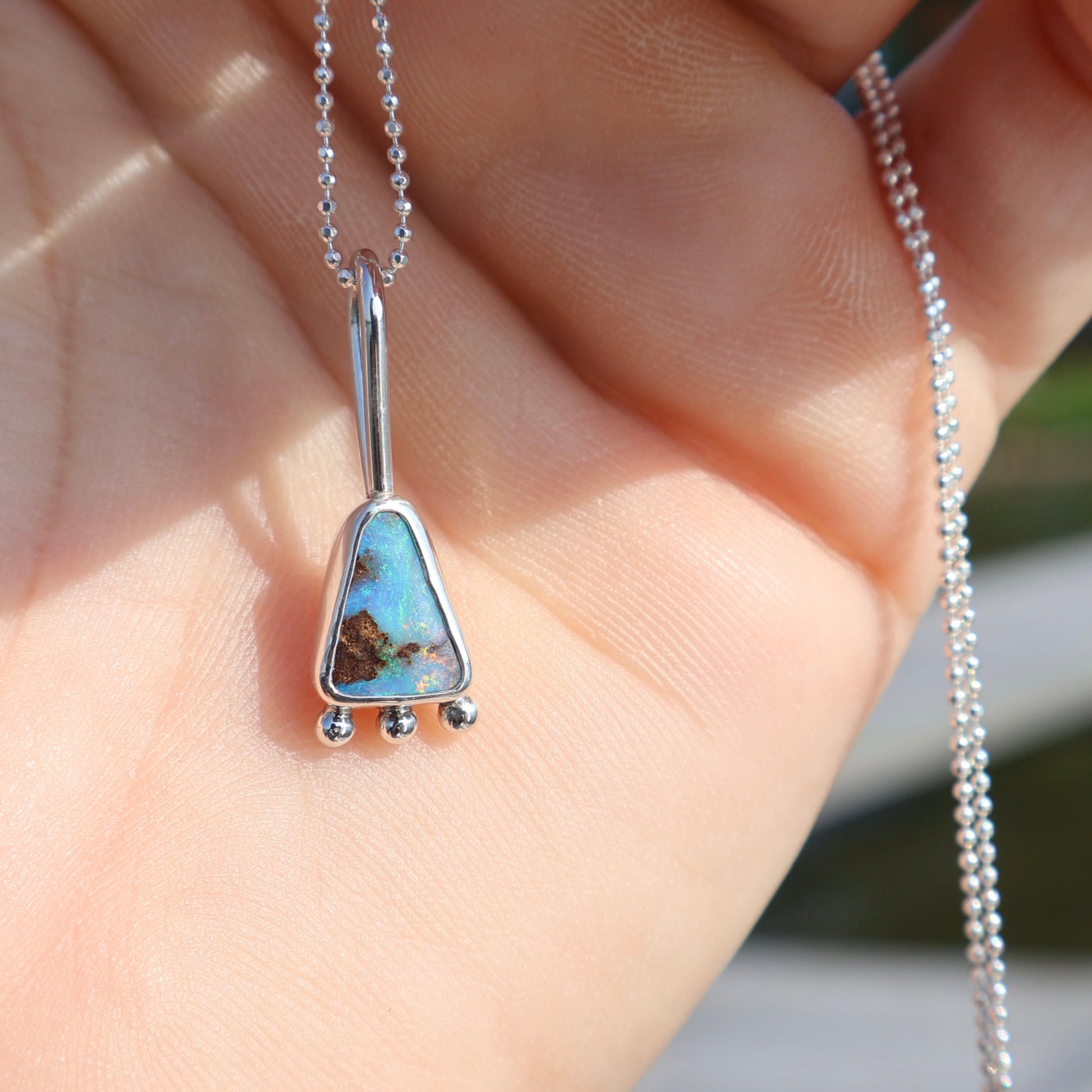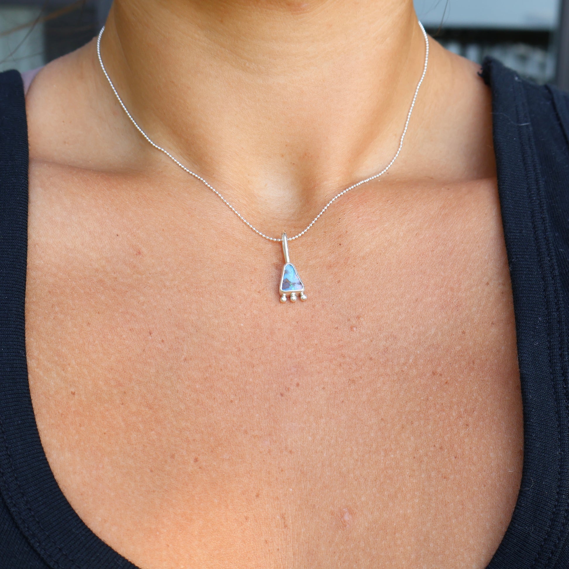 This stunning blue Australian opal pendant features a vibrant play of color, showcasing deep ocean blues with flashes of green and pink. Set in sleek, high-polish sterling and fine silver, the natural opal's unique pattern adds a touch of elegance and mystique.