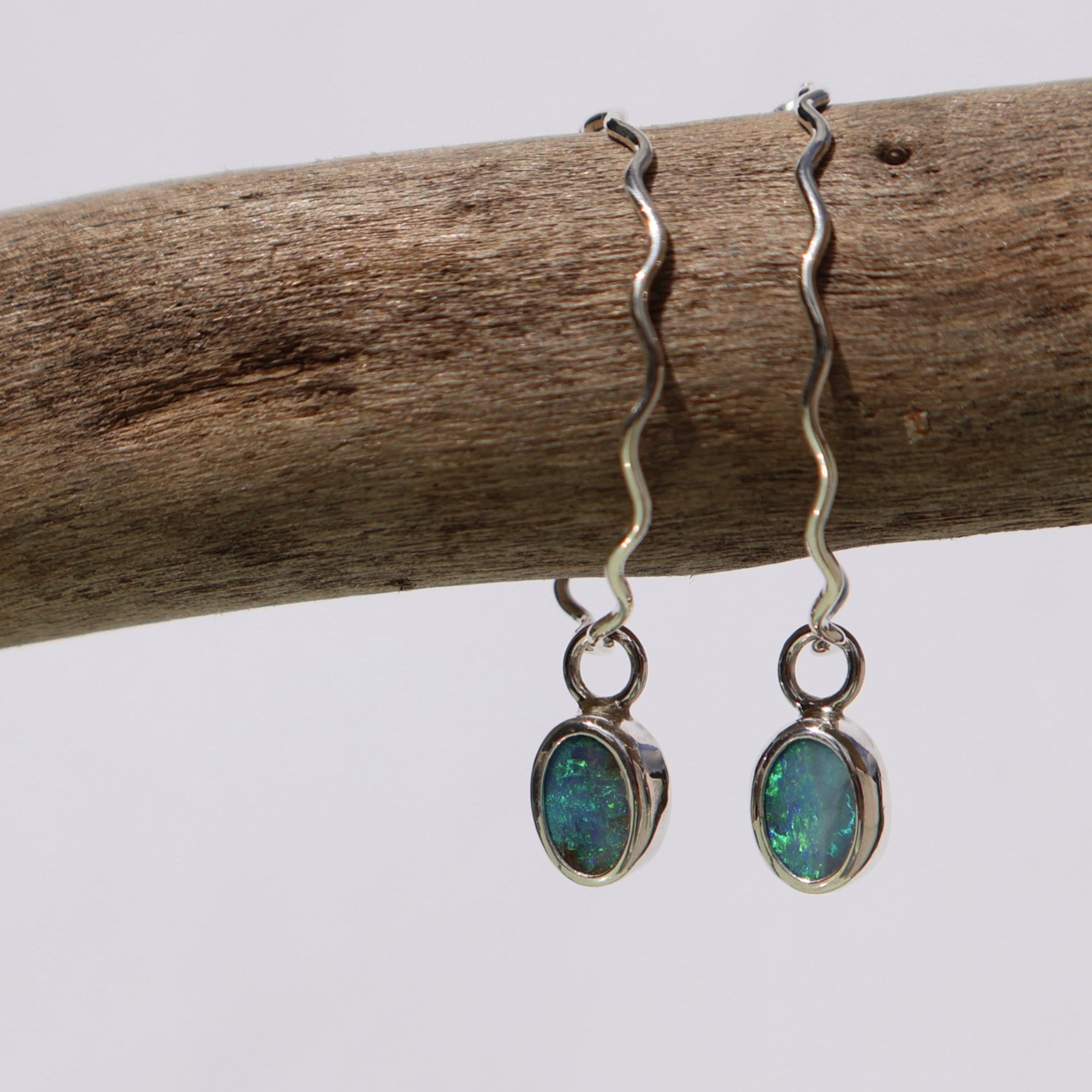 Wavy sterling silver hoops featuring vibrant green and blue Australian opal charms. Lightweight, luminous, and inspired by ocean tides.